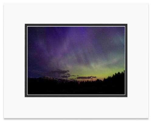 The northern lights, captured looking north up the Columbia Valley towards Kicking Horse Mountain Resort and the Purcell Mountains.