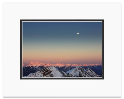 Looking east from Kicking Horse Mountain Resort, the Canadian Rockies are highlighted by a stunning alpenglow with the full moon rising up above them.